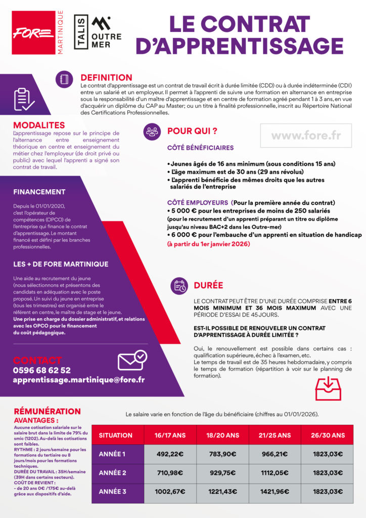 Le contrat d’apprentissage est un contrat de travail écrit à durée limitée (CDD) ou à durée indéterminée (CDI) entre un salarié et un employeur. Il permet à l’apprenti de suivre une formation en alternance en entreprise sous la responsabilité d’un maître d’apprentissage et en centre de formation agréé pendant 1 à 3 ans, en vue d’acquérir un diplôme du CAP au Master; ou un titre à finalité professionnelle, inscrit au Répertoire National des Certifications Professionnelles.